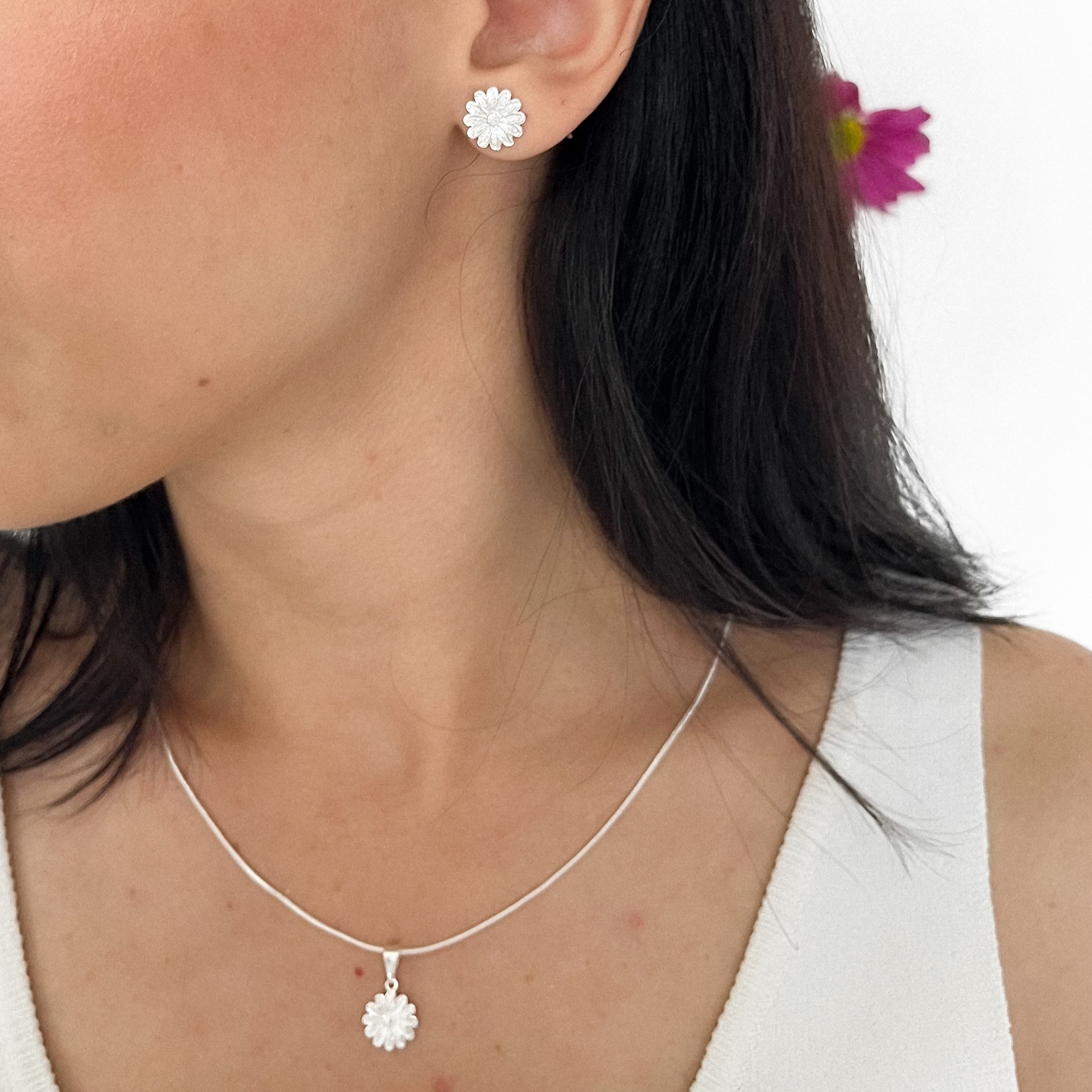 Brinco Margarida com detalhes em relevo, 1cm de diâmetro, banhado a prata.