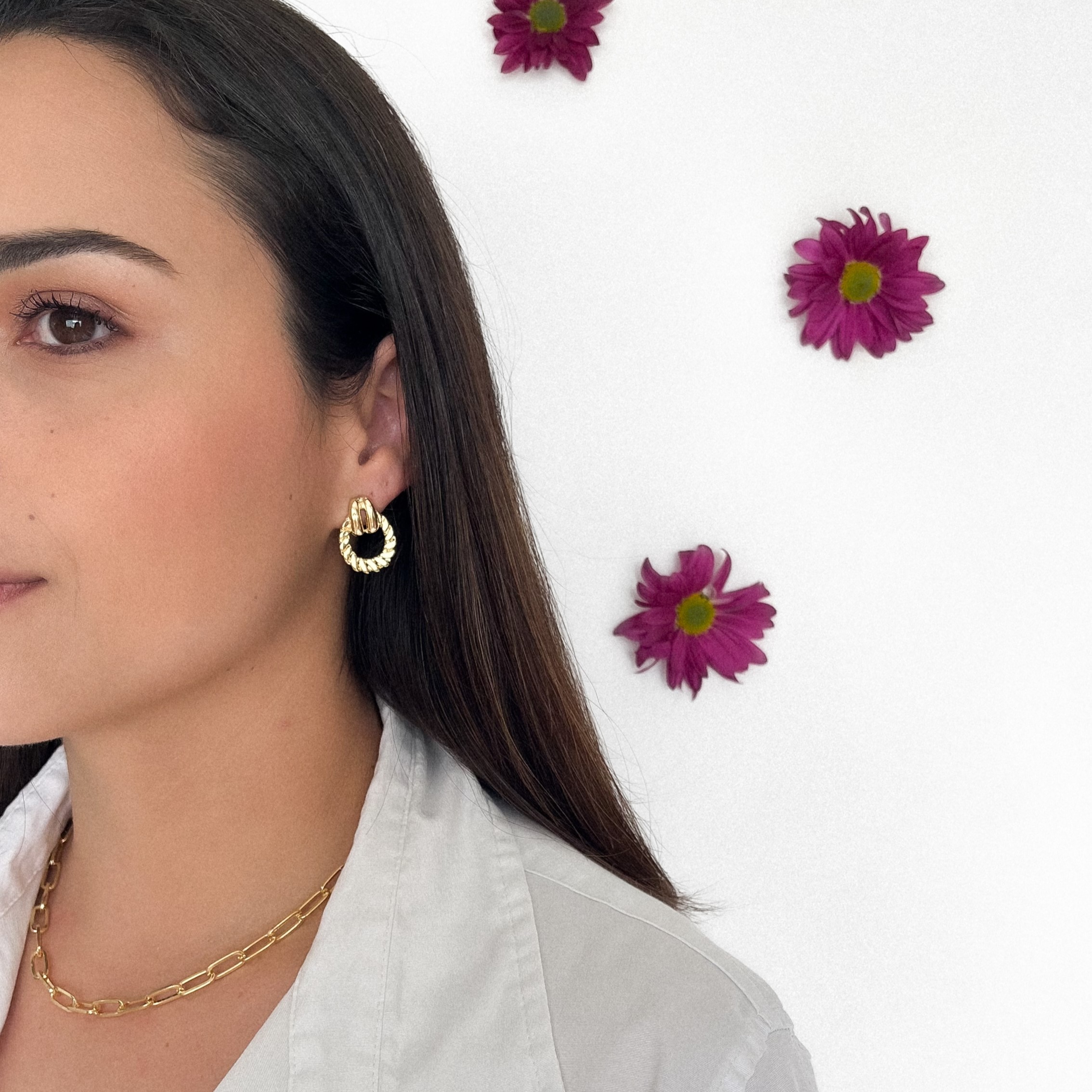Brinco Aro Trançado, 2,3cm, banhado a ouro 18K. Um design clássico com um toque de modernidade, ideal para compor looks elegantes e versáteis.