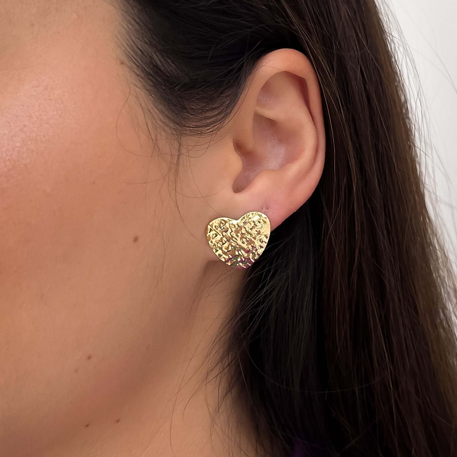 Brinco Coração Amassado 1,5cm, disponível em Ouro 18K ou prata, combina delicadeza e modernidade em um design encantador. Perfeito para dar um toque de charme a qualquer produção.