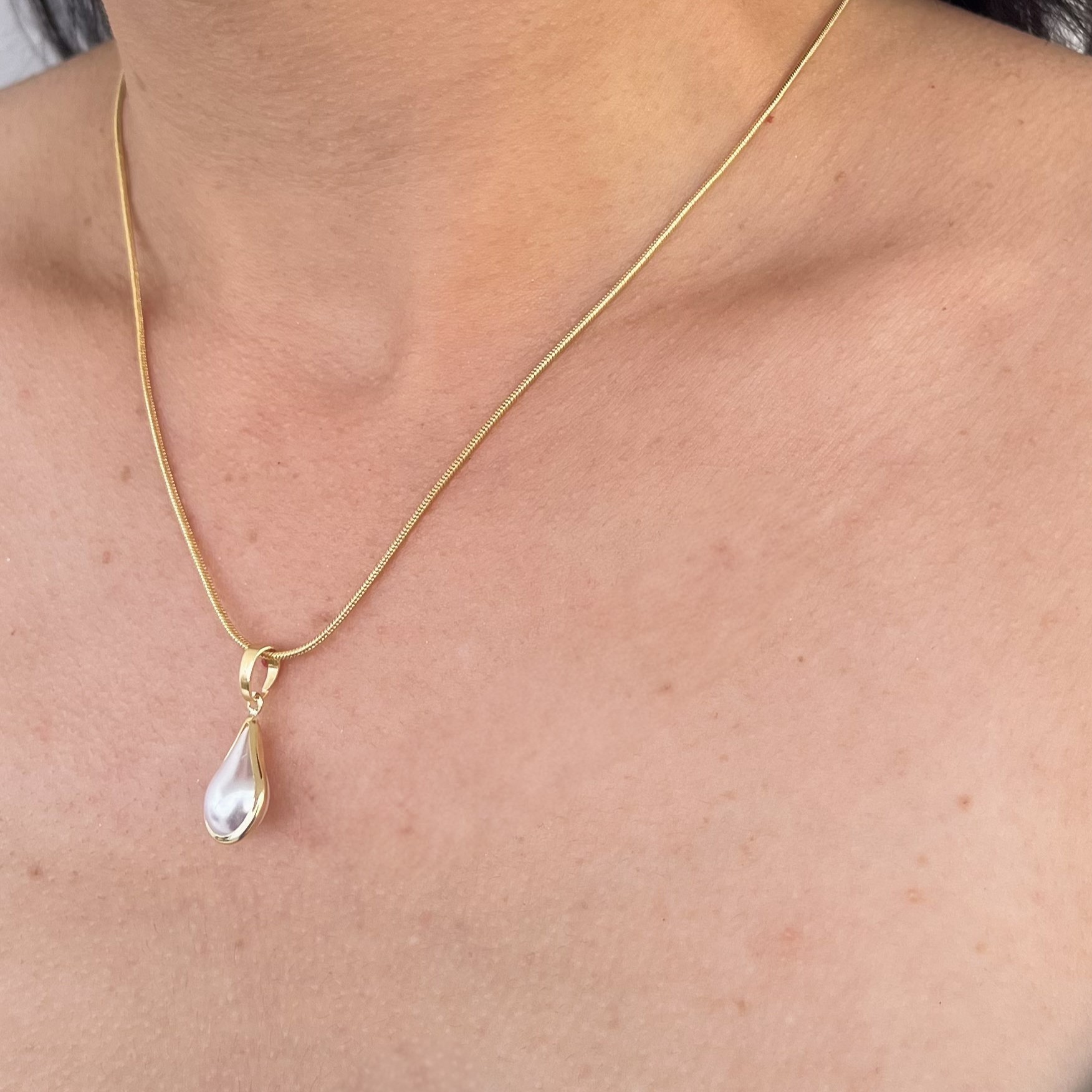 Pingente Gota de Pérola 14 mm com Borda Lisa, banhado a Ouro 18K, é um toque de elegância clássica e delicada.